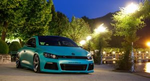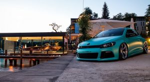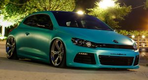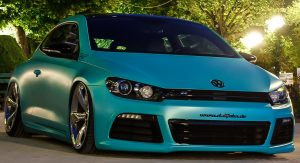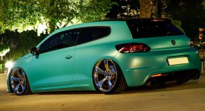 Leave it to foil wrapping firms to come up with flamboyant colors like the “Matt Caribbean Metallic” used here on a slammed VW Scirocco R.