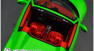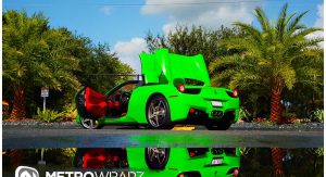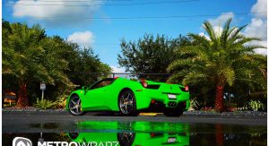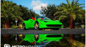 If you ask politely, Ferrari would probably give you a custom-ordered lime green paint job, but if it doesn’t, there’s always the foil wrap solution, as depicted on this 458 Spider made by Florida-based MetroWrapz.