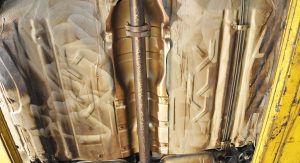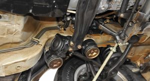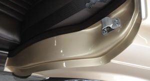 The undercarriage appears essentially as new as well with the original honey colored waxol protectant intact. Undercarriage hardware fairly glows. The exterior brightwork remains spectacular with negligible evidence of use. Window/windshield/back glass and door cap brightwork are stunning. The wheels reveal zero blemishes.