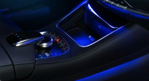 The interior features a carbon fiber strip across the dashboard as well as a blue ambient lighting theme which of course can be changed depending on personal preferences.