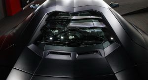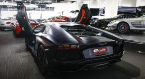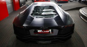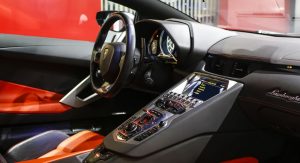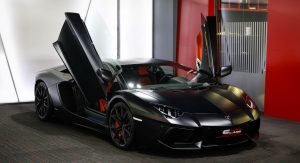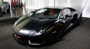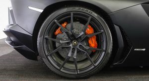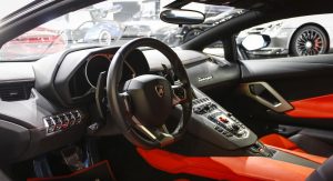With a stealthy black finish, black rims and orange brake calipers, this Lamborghini Aventador shouldn’t have a problem standing out in a crowd of exotic rides.