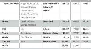 Jaguar Land Rover was the leader in vehicle production in the UK last year, with 489,923 units put together in Castle Bromwich, Halewood and Solihull, up 9.0 percent over 2014, followed by Nissan, with 476,589 units produced in Sunderland, a 4.7 percent decrease. Full data is available below.