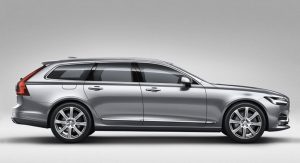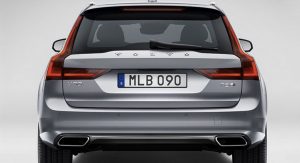 Based on the new S90 sedan, the V90 adopts a similar rear end styling to Volvo’s Concept Estate model from the 2014 Geneva Motor Show, with distinctive ‘L’ shaped rear lights that extend to the car’s roof, along with a slanted rear window that give it a less boxy look than the V70 it essentially replaces.