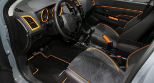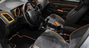 In addition, both cars come with mesh inner grilles, skid plates on the front, and roof boxes for carrying extra equipment; the L200 GEOSEEK sports working lights and hand holds fitted to the roof rails, while the ASX GEOSEEK obtains LED fog lamps, but other than that, the automobiles are exactly like the stock variants. The cabins were revised as well, coming in black with orange highlights and seats finished in a combination of mesh and suede-like fabrics