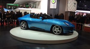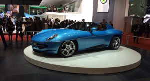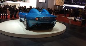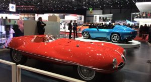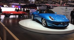 Paying tribute to the 1952 Alfa Romeo C52, known as the Disco Volante (Flying Saucer), which is also present at the Geneva event, the Blue Ceruleo (Sky Blue) painted model is based on the Alfa Romeo 8C Competizione Spider.