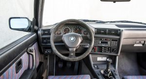 The development of the M3 E30 reached its highest mark in 1990 with the arrival of the BMW M3 Sport Evolution, available only in Gloss Black or Brilliant Red. The new arrival developed up to 238 hp from its four-cylinder in-line engine, now with 2.5-liter displacement – up more than 22 percent compared with the standard BMW M3 at the time. The intelligent lightweight construction of components including the front wings, muffler, front spoiler, trunk lid and rear wing brought the curb weight down by around 77 pounds. The adjustable splitter on the front spoiler and 16-inch light-alloy wheels with Nogaro Silver star in the center of the rim were among the most distinctive external features of the BMW M3 Sport Evolution. Inside, the front bucket seats with integral head restraints, red seat belts and suede leather covers for the sports steering wheel, handbrake lever and gearshift lever knob underlined the car’s sporting prowess. Another key mark of this M3 version – of which only 600 were produced – was the “Sport Evolution 1990” badge on the center console.