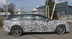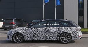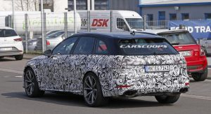 As evidenced by the attached fender extensions, the RS4 Avant you see here is an S4-based test mule, although one that incorporates a differ front bumper with larger air ducts along with bigger wheels and brake discs, and RS-style oval pipes at the back.