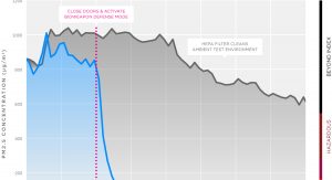 Two minutes after closing the falcon-doors, the HEPA filtration system reduced the hazardous 1,000 µg/m3 polluted air to undetectable levels, allowing the technicians to remove their gas masks and breathe fresh air inside the car.