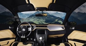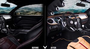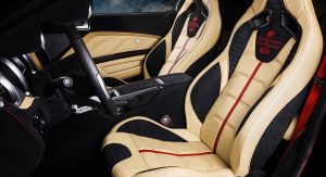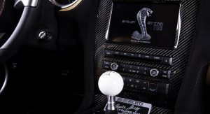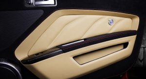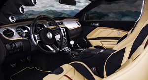 Commissioned by a Romanian customer, the muscle car’s cabin has been completely modified, except for the silver dashboard panel, door handles and gear lever ball. The original Shelby number plate has been left in place, but the rest of the interior carries beige leather and Alcantara-wrapped steering wheel, steering column, transmission tunnel and parts of the doors.