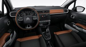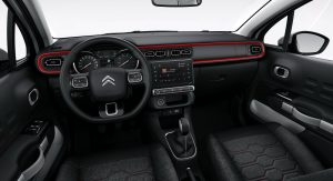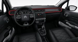 Citroen offers its new supermini in 36 possible color combos, with nine body shades and three colors for the roof, joined by four interior themes, including the Urban Red, which adds a red dash panel finish and red stitching.