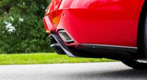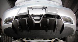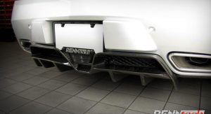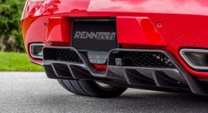 A carbon fiber diffuser, priced at $4,495, is supposed to decrease drag and increase downforce by improving underbody airflow. Renntech states that the new part is easy to install, but advises owners that, once in place, it will partially obscure the standard reverse camera and offers an optional camera housing extension.