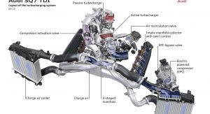 The first engine of the new V8 family has just debuted under the bonnet of the SQ7 in diesel form. In this application, it features two conventional turbochargers and -for the first time- an electric compressor to keep the turbos spinning regardless of the engine speed.