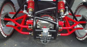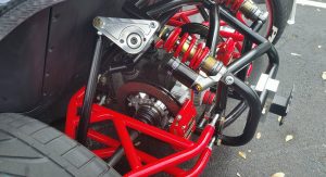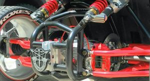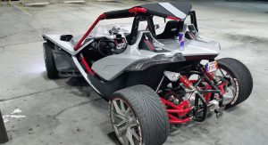 Styling wise, the Slingshot undoubtedly looks great sitting on four wheels. Bullet Speed and Design says that, due to their bolt-on solution, zero fabrication is required. That means nothing on the Slingshot has to be cut off, as the upgrade kit can be directly mounted. Featuring Formula 1-inspired push-rod/rocker IRS rear suspension, an Infiniti G35 3.53:1 limited slip diff and Bullet’s own custom drive shaft, the modded Slingshot is well equipped for driving thrills.