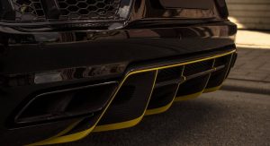 Despite its dark exterior, the yellow stripes are carefully positioned so as to point out the R8’s most important design lines, such as its massive front grille and aggressive spoiler, its fenders, its profile and of course its rear wing and diffuser.