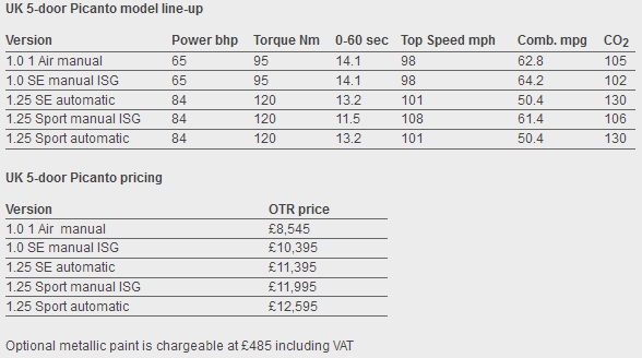 In terms of equipment levels, the entry-level 5-door Picanto now comes with air conditioning as standard (free upgrade), as well as Bluetooth, a leather-trimmed steering wheel and front seat belt height adjustment. Mid-range ‘SE’ grade models adds automatic air-conditioning and Kia’s Intelligent Stop & Go (ISG) stop/start system with the manual gearbox.