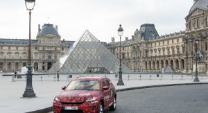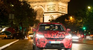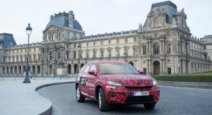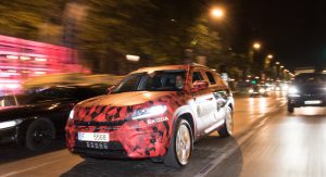 Sporting its new red, grey and black camouflage foil, with facets made of crystal-like elements to mimic the looks of the Red Car Skoda Superb, finished in Corrida Red that served as a mobile control center at the competition, the Kodiak has been getting itself familiar with the event’s home straight, with some nighttime driving on Champs-Elysees.