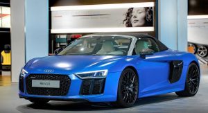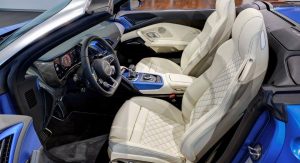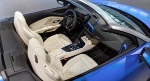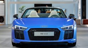 This Arablau Matt R8 Spyder is more than just the wearer of an exclusive color scheme. It’s also got 10-spoke Y-design alloys, carbon fiber mirrors and side blades, Performance leather steering wheel, plus full leather trim interior with Alabaster White seats, carbon fiber inserts and other body-colored elements.