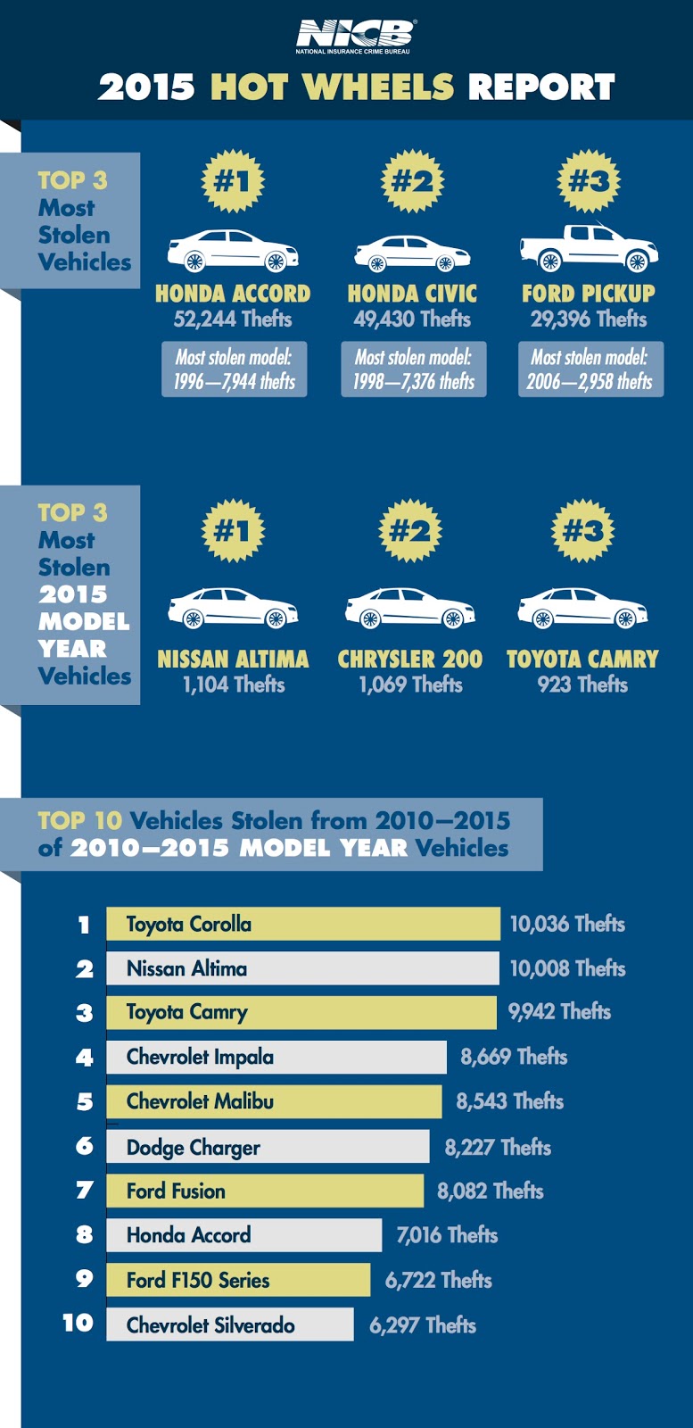 Further down in the #3 and #4 spots are full-size pickups from Ford and Chevy, with 29,396 and 27,771 examples stolen last year, respectively. The Toyota Camry comes next at 15,466, followed by Dodge pickups (11,212), the Toyota Corolla (10,547), Nissan Altima (10,374), Dodge Caravan (9,798) and Chevy Impala (9,225).
