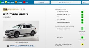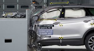 The 2017 Hyundai Santa Fe has Good ratings in the moderate overlap front, side, roof strength and head restraint tests as well, while its optional front crash prevention system, ranked Superior, has allowed it to avoid collisions in the 12 mph (19 km/h) and 25 mph (40 km/h) track tests. The system also includes a forward collision warning, which meets the NHTSA’s criteria, and it’s part of a technology package that includes the curve-adaptive, high-intensity discharge headlights, rated Good in the IIHS’ evaluations, but without the optional package, the Santa Fe’s halogen headlights earn a Poor rating.