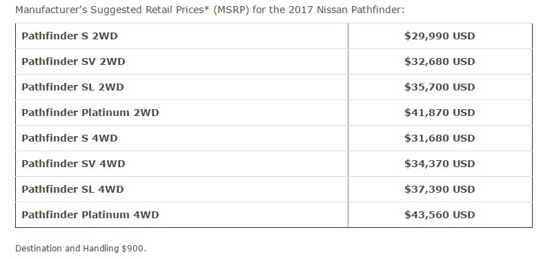 The 2017 Nissan Pathfinder is available both in 2WD and 4WD configurations and in four trim levels: S, SV, SL and Platinum. Prices start at $30,890 (including destination and handling fees) for the S 2WD model with the range-topping Platinum 4WD asking for $44,460.