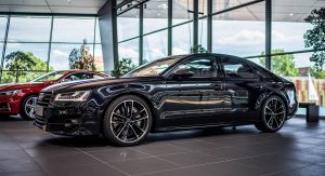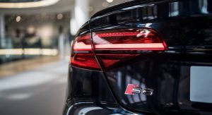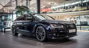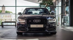Of course, this particular S8 plus also stands out due to its Audi Exclusive looks, boasting a Carbon Black Metallic exterior, Anthracite Black 5-double spoke wheels and a surprisingly flamboyant interior – for an Audi A8/S8 that is.