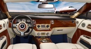 From the outside, the Wraith Regetta can be differentiated from a run-of-the-mill example thanks to the installation of mahogany across the hood, roof and the rear decklid. Complementing the mahogany is satin-finished aluminum trim and a set of silver wheels with subtle red and gold accents.