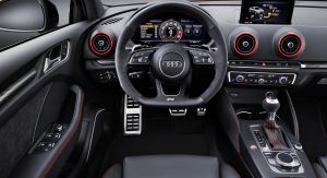 At the interior, the car comes standard with an electrically extending MMI screen with a 7-inch diagonal, and two circular instrument dials. Since the car is dedicated to the enthusiastic driver, it also comes equipped with a boost pressure indicator, an oil thermometer and a lap timer. However, if this “back-to-basics” scheme doesn’t appeal to the customer, the RS3 Sedan can also be commissioned with the fully digital Audi virtual cockpit.