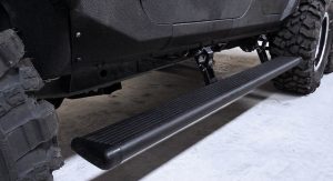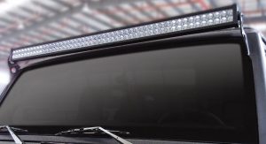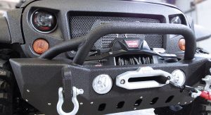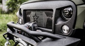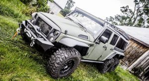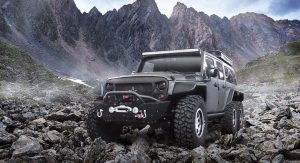 Much of the vehicle’s exterior styling remains unchanged from the Wrangler with the exception of a bespoke front fascia and grille and some tweaks to the rear. A set of 17-inch alloy wheels with 35-inch Mickey Thompson tires have also been installed as has a remote-controlled electric winch.