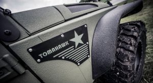 According to Car News China, in order to create the Tomahawk, G. Patton cut the American off-roader behind the C-pillar and then added an enclosed pickup truck bed. It also went about outfitting the Pentastar 3.6-liter V6 engine with a supercharger and, while no performance figures have been released, the added oomph should help offset the added weight.