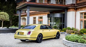 The color contrasts on this particular example with the dark chrome and especially the blacked-out wheels, and even continues inside where the black leather is highlighted in that same shade of bright yellow. It certainly catches the eye, but does it belong on a Bentley – particularly one as (otherwise) dignified as a Mulsanne? We’re not so sure, but then we’re not the ones ponying up the $335k to put one in our driveway.