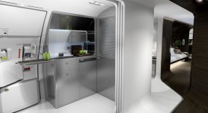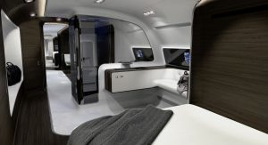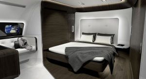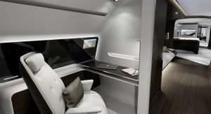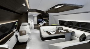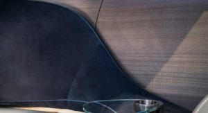 Even more impressive (to our eyes anyway) is the private jet cabin that Mercedes-Benz Style has designed with Lufthansa Technik. The design is envisioned for an Airbus 320 or Boeing 737 – the type of aircraft you might have flown commercially on a short- or medium-haul flight, but is here transformed for private use. It includes a private bedroom, kitchen, on-board theater, bathroom with shower (that’s right, a shower on an airplane), a dining section, kitchen, office, and a variety of seating and lounging areas to suit any taste. It’s not as much about what it has, though, as it is about how it incorporates it all, with a flowing design that melds floor, ceiling, walls, and even seats into an organic form.