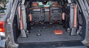 At least the big-box styling leaves easy amounts of room for three across the second row, where they can play with the antiquated-looking rear entertainment system (just put some iPad mounts in, guys). It’s the third row that sucks, though. Kids and adults will be frustrated by the lack of room to get into the flip-up split bench back there. And it leaves such little cargo space that I kept them down and flipped to the side pretty much all of the time.