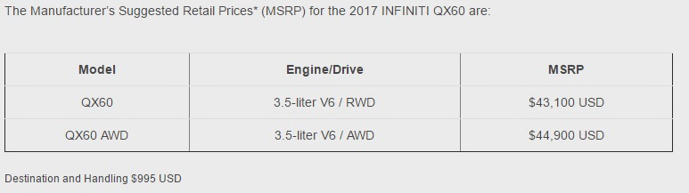 Pricing starts at $44,095 (including destination and handling fees) for the base rear-wheel driven Infiniti QX60 while the AWD version is priced accordingly from $45,895.