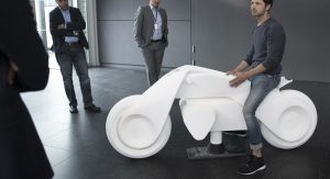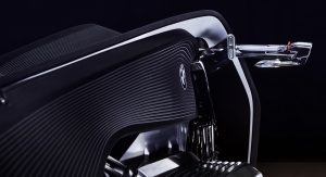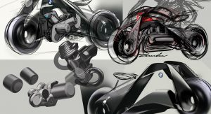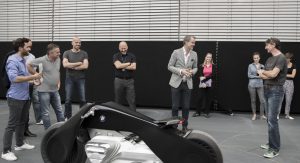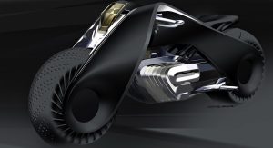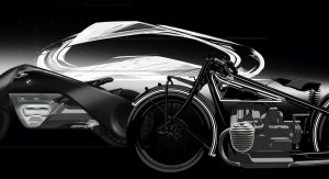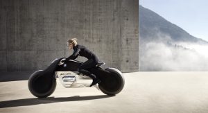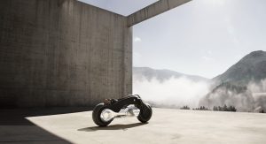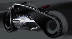 The powertrain was designed to mimic the style of the traditional BMW boxer engine but it’s actually just a case for the zero-emissions drive unit. It also changes its shape, extending outwards when the bike sets off to enhance aerodynamics and protect the rider ‘from the elements’.