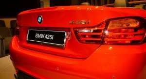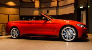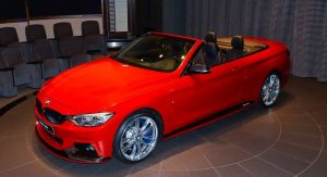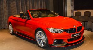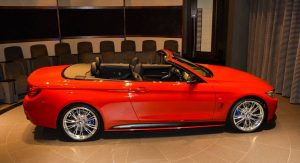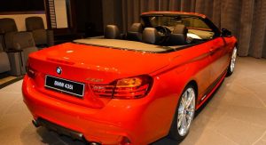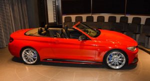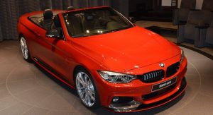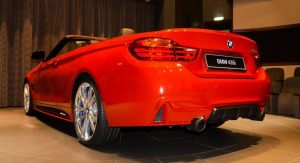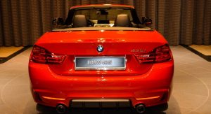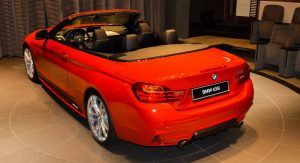 On display at BMW‘s Abu Dhabi showroom is this Melbourne Red 435i Convertible, which just so happens to be wearing a carbon fiber-heavy M Performance kit as well as an Akrapovic Evolution exhaust system.