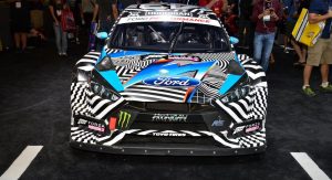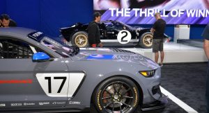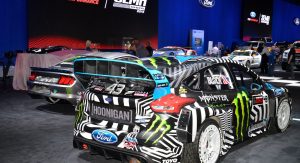 Beyond the Mustangs, a handful of Ford race cars can be found in the Las Vegas Convention Center, including Ken Block’s Ford Focus RS RX rallycross car, a Ford GT GTE racer and an original Ford GT40.