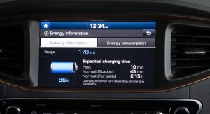 At the moment, Hyundai’s offering in the electric segment has a 28 kWh lithium-ion polymer battery, made by LG and located beneath the rear seats, which powers the 120 HP (122 PS) and 215 lb-ft (292 Nm) of torque electric motor. It can be recharged up to 80 percent in 20 minutes with a fast charger and the maximum estimated driving range sits at 110 miles (177 km).
