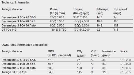 Priced from £12,205, the Twingo Dynamique S slots below the GT and uses an 898 cc engine, with either 70 PS (69 HP) and 91 Nm (67 lb-ft) of torque, or 90 PS (89 HP) and 135 Nm (100 lb-ft) of torque. The latter allows it to sprint from 0 to 62 mph (100 km/h) in 10.8 seconds, with either the manual or automatic gearbox, and top speed sits at 103 mph (166 km/h).