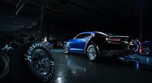 The front three quarter of this COPO Camaro is finished in satin blue (dubbed Hyper Blue Metallic) which has then been offset with a gloss black rear end and a ‘350 Supercharged’ red and white livery. The finished product looks the most appealing of any unit we’ve seen so far and is bound to turn heads at the drag tripe.