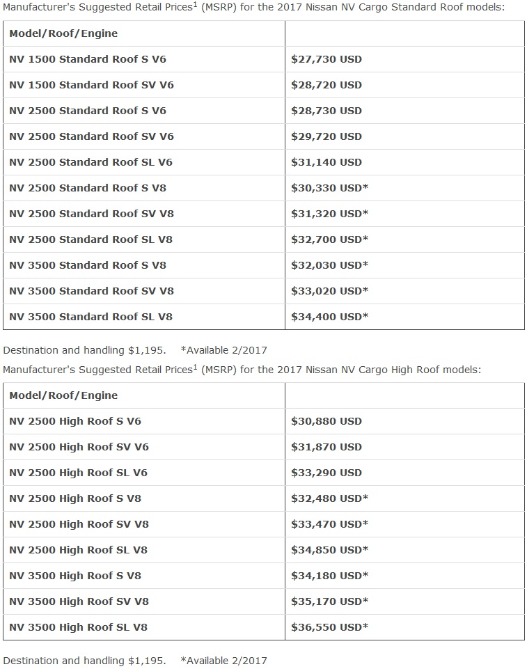 The new V8 is available for both the NV Cargo Van, which comes in three models: NV1500, NV2500 HD and NV3500 HD, and two roof configurations, Standard and High, as well as the NV Passenger Van, which is offered only as an NVP3500.