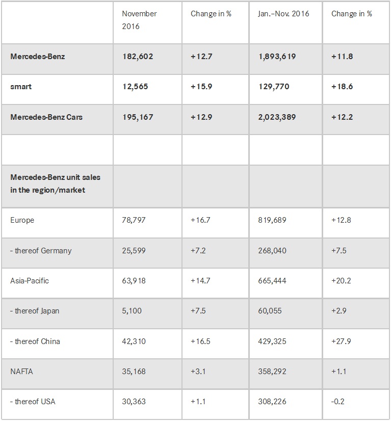 Mercedes-Benz’s officials are, understandably, satisfied with those results: “With double-digit growth since the beginning of the year, we surpassed last year’s total unit sales by the Mercedes-Benz brand already in November. This makes 2016 a new record year for Mercedes-Benz“, commented Member of the Board of Management of Daimler AG, responsible for MB Cars Marketing&Sales, Ola Kallenius.