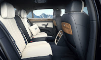 The cabin is upholstered in cream and blue leather with quilted stitching reminiscent of the Union Jack on the door panels. There’s even flag-embroidered throw cushions for the back seat and a champagne cooler in the back. The most unique element, however, is the wood veneer.