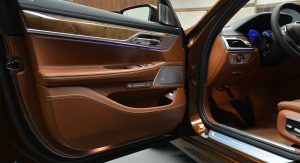 Inside, the seats have been bathed in a sophisticated shade of brown and complemented by wooden accents and black leather across the upper half of the dashboard and the steering wheel.