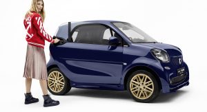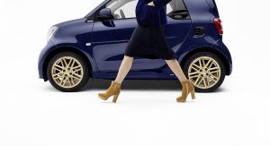 Characterized by Vogue.com as one of the world’s leading street-style icons, the fashion director of online magazine “hey woman!” designed this Fortwo in a special shade of Velvet Blue with gold wheels, and a black leather interior with red accents (including her initials stitched into the headrests and the ruby-tinged glass-capped shift knob.