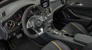 Finally, the GLA 45 4MATIC Yellow Night Edition is priced from £53,135 and is available [the spec] not just on the GLA 45, but also on the A 45, CLA 45 and CLA 45 Shooting Brake. Standard features include the AMG aerodynamics pack, AMG Night pack, 20″ AMG 10-spoke alloys with yellow-painted rims, body styling with yellow accents on the diffuser, rear wing and mirror housings, cosmos black metallic paint, Keyless-Go Comfort pack, AMG performance steering wheel in Nappa leather and Artico leather upholstery with yellow highlight stripes.
