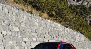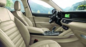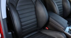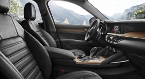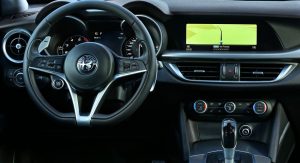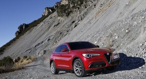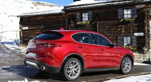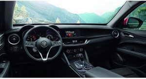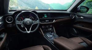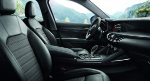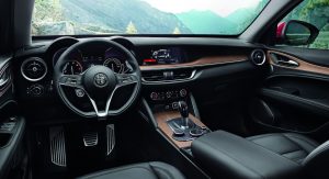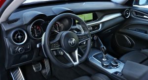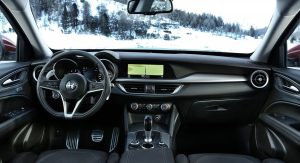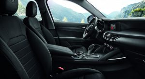 In terms of trim levels, the UK version of the base Stelvio features 17″ alloys, an 8.8″ display, Alfa’s D.N.A Rotary selector, 8-speaker audio system, black fabric seats, Integrated Brake System, Lane Departure Warning and Forward Collision Warning with Autonomous Emergency Brake and pedestrian detection. This version also comes with parking sensors, cruise control, electric tailgate and dusk & rain sensors.