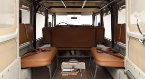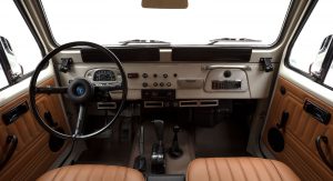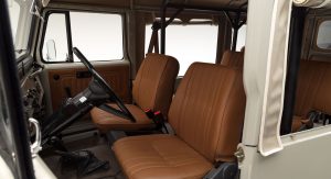 The restomod shop resprayed it in Toyota OEM beige, upgraded the suspension with Old Man Emu components, fitted a custom soft top, upgraded the exterior lighting with LEDs, replaced the rusty old badges with new ones, trimmed the interior in tan vinyl, and fitted modern air conditioning and audio systems. It also upgraded the 3F engine and automatic transmission, which was already the most powerful version in the series.
