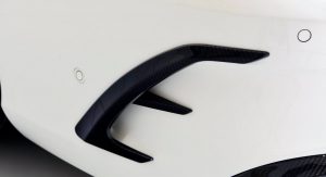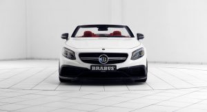 The Brabus 850 Cabrio sits closer to the road thanks to its lowered ride height (15 mm / 0.6 inches), and looks more aggressive than the S63, mostly because of its carbon fiber aero kit – which in this case, creates an interesting contrast to the all-white body, as does the red interior.
