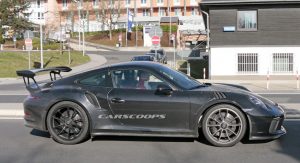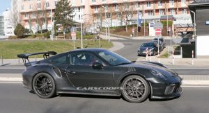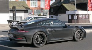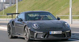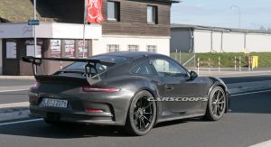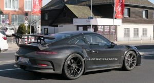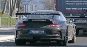 This car made its presence known to nearby camera lenses on German public roads, while showing slight exterior upgrades that mirror those we saw on the regular GT3 in Geneva.