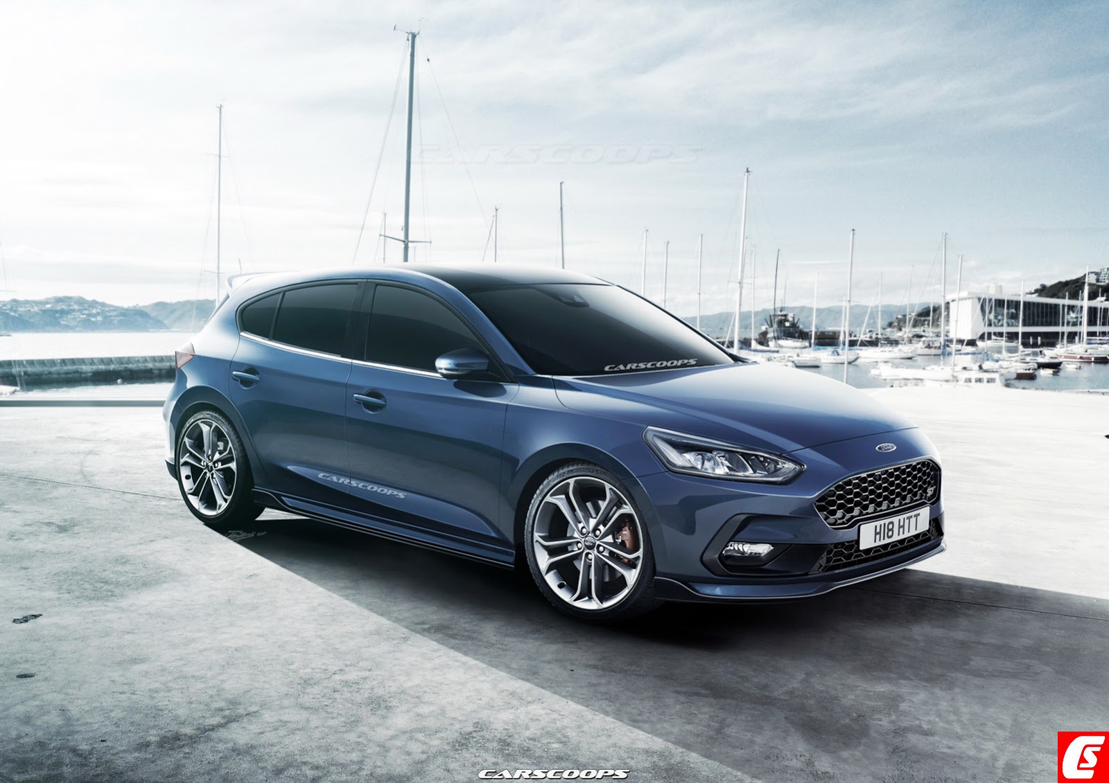 Illustrated here in ST-guise, the all-new car wears a similar face to its smaller sibling – the latest Fiesta. Although here, the headlamps are deeper, more angular and perched above some rather angry-looking fog light housings.